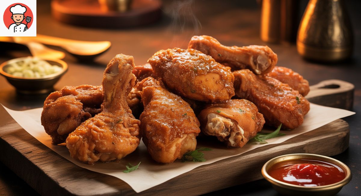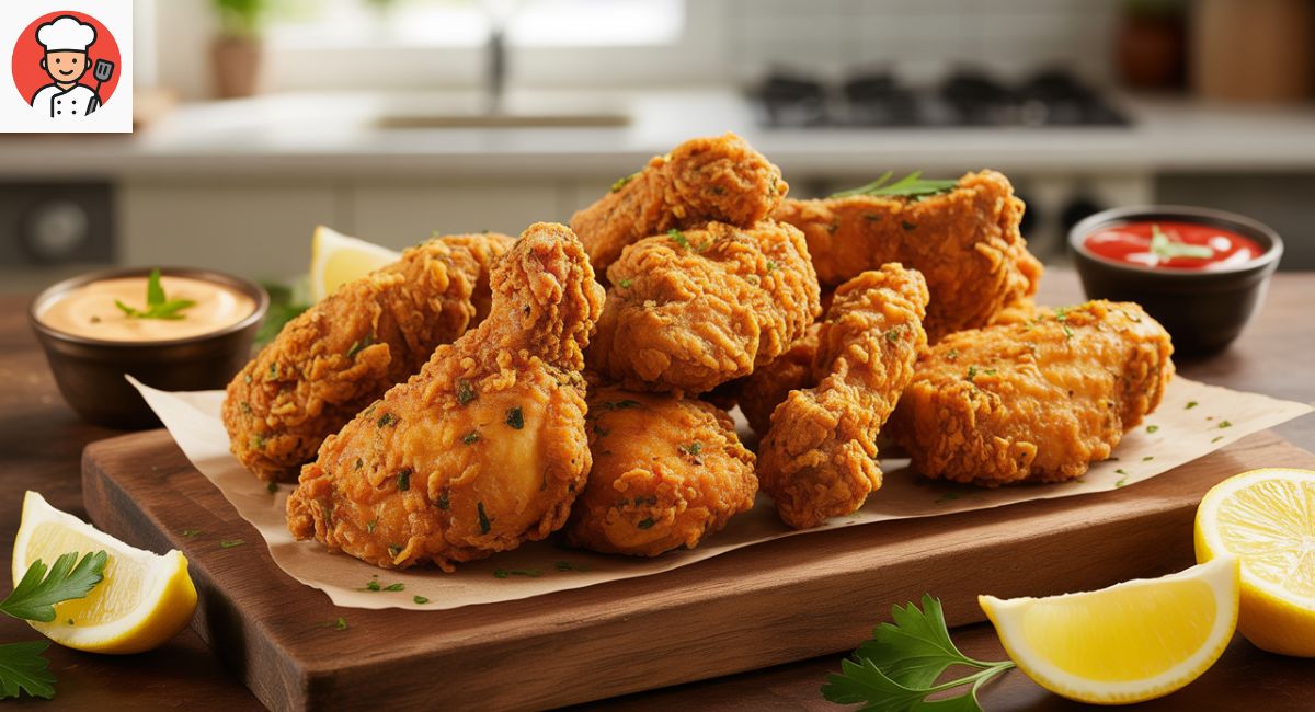 Coated with care full chicken pieces into the hot oil. Fry 3 into 4  pieces at a time to maintain temperature. Fry until golden brown and crispy, around 8–10 minutes per batch.